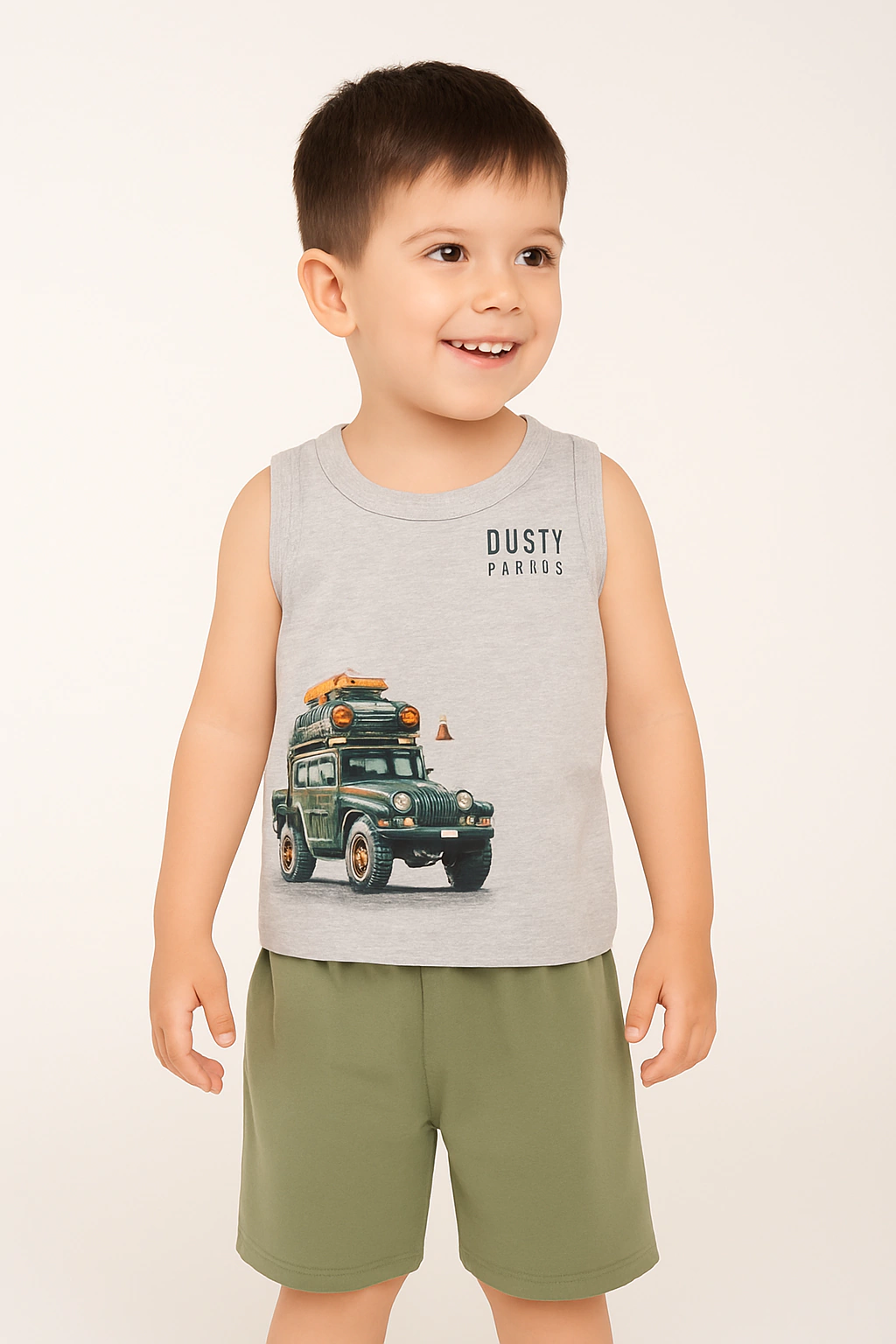 O Conjunto Infantil Menino Kyly é composto por regata em meia malha e bermuda em moletom sem felpa, ambos com composição de 100% algodão.