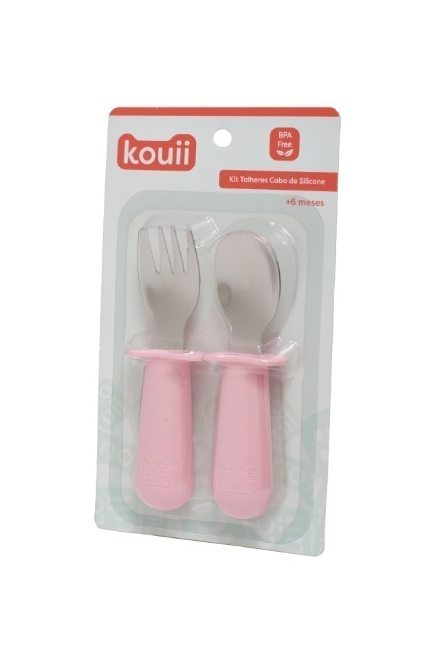 Kit de talheres com cabo de silicone e aço inoxidável.