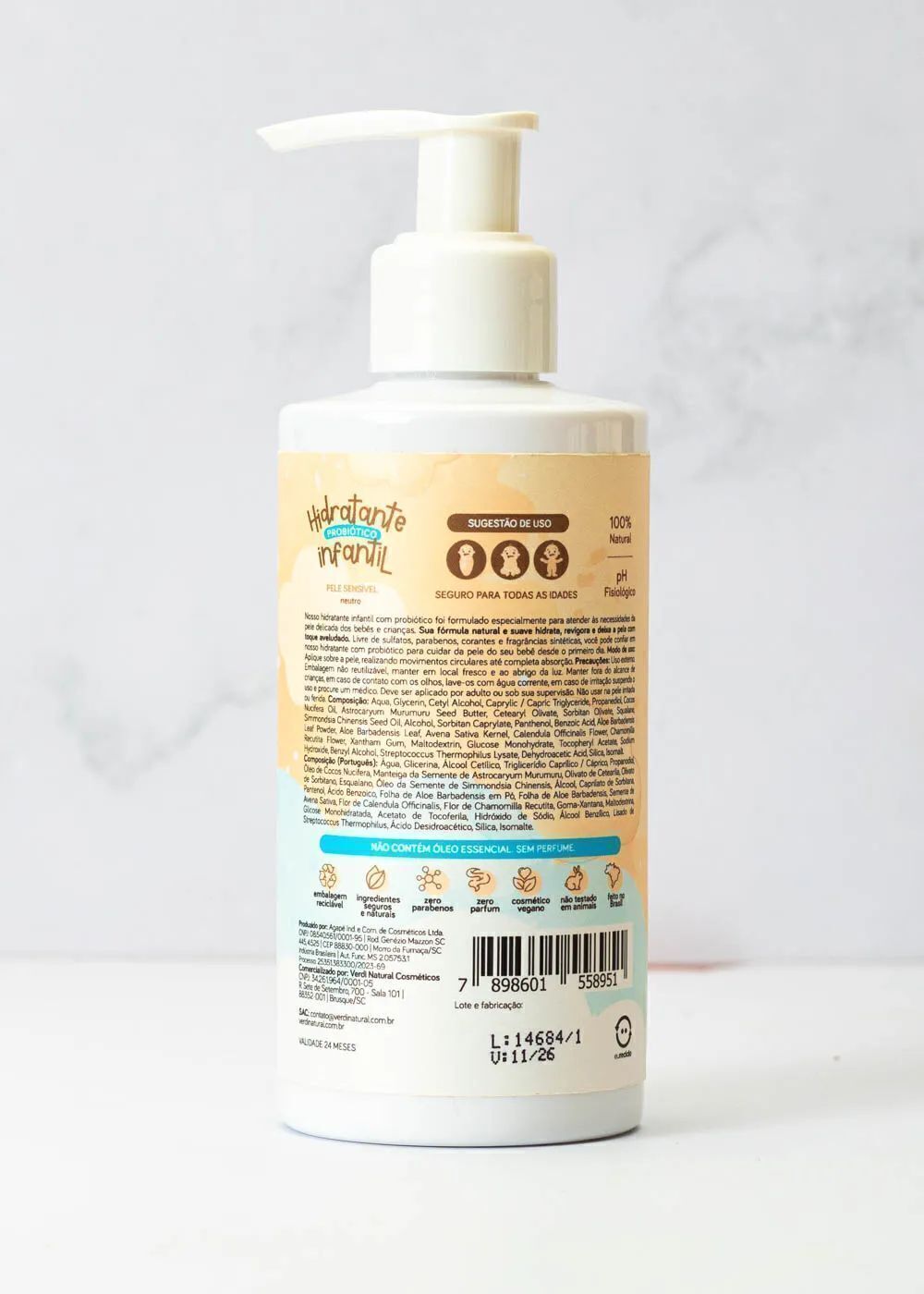 A Loção Hidratante Probiótico para pele sensível da Verdi Natural foi especialmente desenvolvido para hidratar e proteger a pele delicada do recém-nascido, bebê e criança.